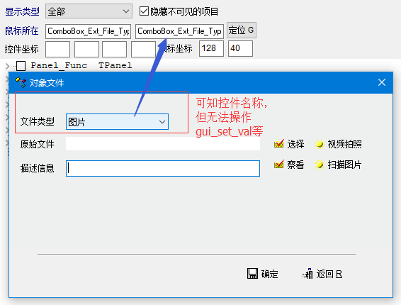 这个功能很实用的啊 还有些的地方控件无法操作,如果支持脚本操作就更方便了。 比如下面的两个截图: 对于第一张图片里的控件,可获取名称,但没法操作。 如进行 gui_set_val等