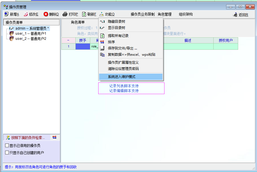 操作员管理功能添加: 1、记录列表脚本支持 2、编辑记录脚本支持