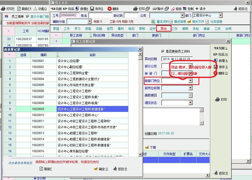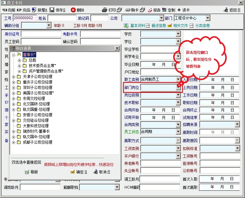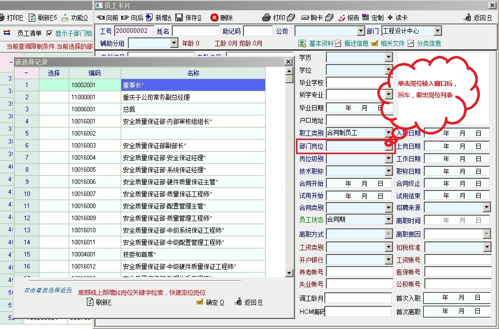 一、onlyit有两个地方需要频繁录入岗位名称: 1、新员工建档录入“部门岗位” 2、调岗调职 录入“原部门岗位”和“新部门岗位” 二、目前onlyit的岗位录入机制有3种: 1、直接输入 2、在“岗位等级列表”中选择(员工卡片-部门岗位 录入框处 双击 弹出) 3、在“岗位清单列表”中选择(员工卡片-部门岗位 录入框处 单击后回车弹出;或在“调岗调职-原/新部门岗位”录入窗口双击 弹出) 三、问题 通过弹出岗位列表(岗位等级列表、岗位清单列表) 点选 岗位的时候,因相似的岗位比较多,查找比较麻烦 四、建议 建议在录入岗位时,调出的“岗位等级列表”或“岗位清单列表”窗口,增加检索功能,输入关键字 快速调出 目标岗位,并选择后录入。 五、附图说明