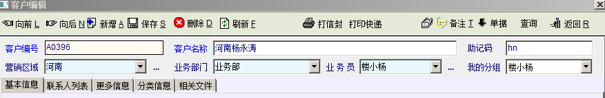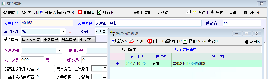 这样行不通,我们的客户群体分布就那几个省或者地区。跟贵司的软件应用不一样,只要是企业都有需求。而从公司运营来说,不利于业务部门的发展和人材的储备。 修改一下销售管理---客户管理-(每个客户的备注信息管理)指令很难吗?只要求下图中业务员操作时(备注信息管理)不要删除不要修改这两项。 PS:楼下朋友,这不是牛不牛的问题,而是我们实际碰到的困扰。即然开发者开了这个平台,我有诉求当然可以提出来,至于开发者想不想改变,那是他要考虑的事,难道不改,作为用户我能吃了他吗?抱歉我说话直,平心而论这款系统已经很强大了,这种强大有一部份来源于用户的使用反馈。这是我第一次也是最后一次提出问题,感谢版主的回答!