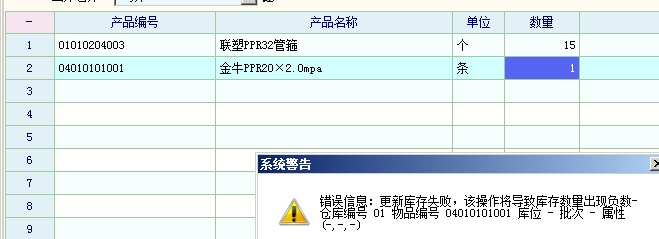 可是我这显示 错误信息:更新库存失败,该操作导致库存数量出现负数 仓库编号01 物品编号 04010101001 库位-批次-属性 这是两个库的东西,在一张出库单上就显示这个