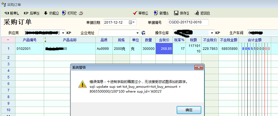 新人第一次来到咱们论坛,需要求助各位大神。 我们公司是从事贵金属贸易的公司,使用的咱们的进销存软件,使用中出现了无法录入的问题,提示错误时“十进制精度的字段过小,无法接收您试图添加的数字”后面还有一段代码。 请问哪位大神能帮忙解决下。再次先谢过了。(这个软件我也很少是都是部门同事再用,如果可以解决请告知具体解决方法,跪谢。。。。)