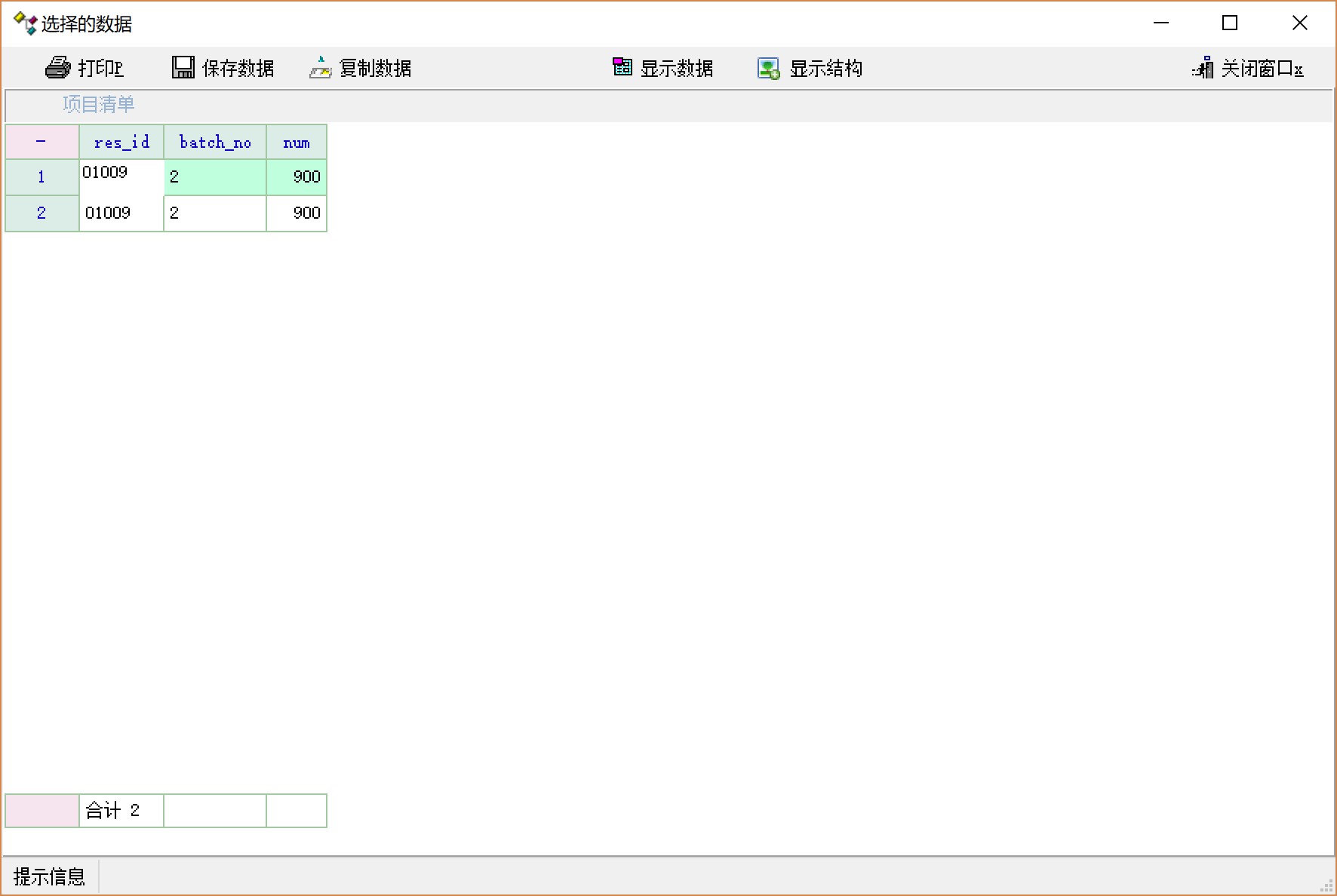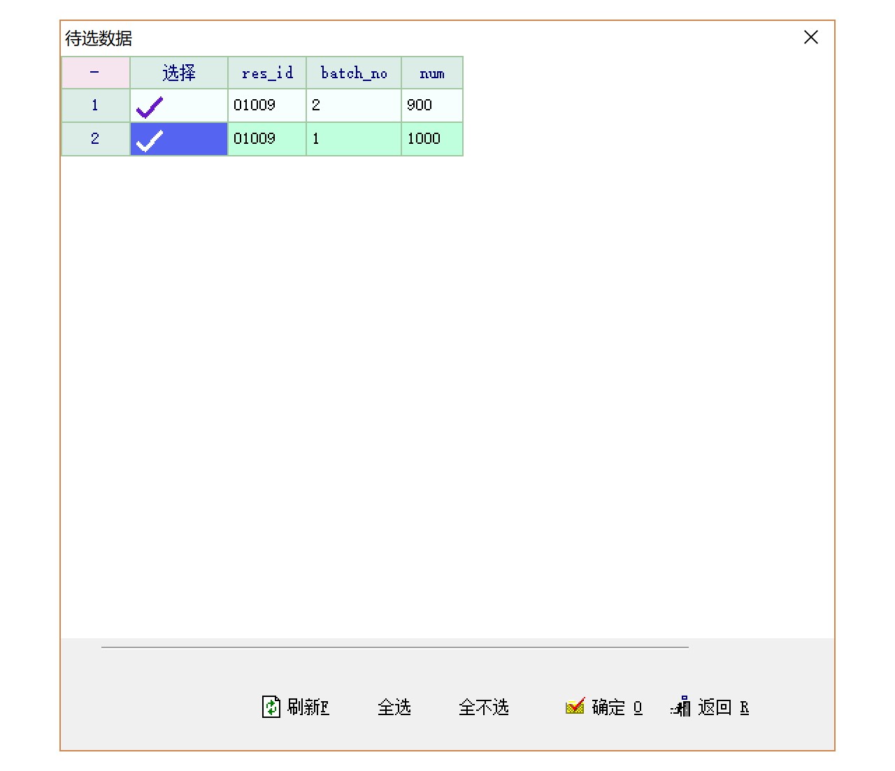 下面是我的实例: 产品属性设为"库存分批次",成本计算设为“批次计价法”;对同一个产品录入两个批次不同数量的入库 源码 int test_db_select_m_copy_res() { db_select_area(0); db_run('select res_id,batch_no,num from edt_res'); if(db_show_and_select_m_as('待选数据')) { db_select_area(1); db_select_m_copy_res(); db_show('选择的数据'); }; db_select_area(0); return 1; };