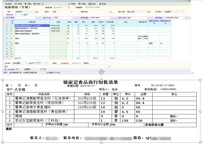 上图为原单据,中图为打印效果。其中的客户关键字为输入过的客户可以直接输入关键字查找并选择客户,然后自动填入其相关信息--联系人,联系电话与地址(只支持一个联系人与一个电话),这样可以不做客户资料录入。 为了解决统计问题,我还写了客户信息查询,成件备货,向其他商家调货,业务员业绩查询,客户拿货非整件和赠送品查询等几个自定义报表。 此方案解决了批发市场经营户的调货,非整件统计,送货备货,赠品物资不确定等问题。 此方案不仅适合单机版也适合网络版(直接分析相关数据表),也适合ACCESS数据库和MSSQL数据库。因兼顾ACCESS数据库,所以不采用存储过程,因此运行时效率稍差些(数据不多时速度差别不明显。经过测试使用ACCESS数据库时十万条数据约2分钟)。 因MYSQL与ORCAL数据库在语法上与微软数据库的差别,可能不适合MYSQL与ORCAL这两类数据库(具体没有测试过) 有兴趣的朋友可以通过QQ号与本人联系。