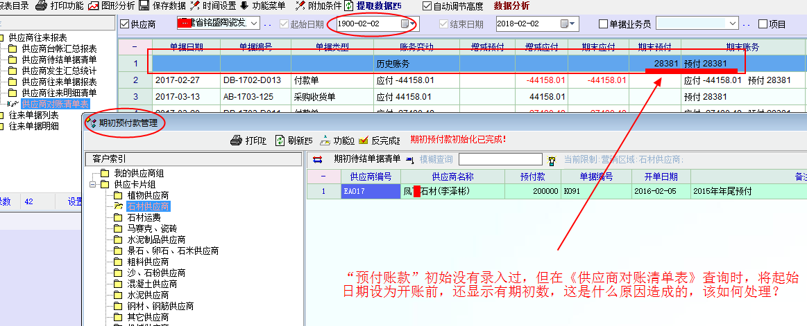 “预付账款”初始对应的供应商没有录入记过数据,但在《供应商对账清单表》查询时,将起始日期设为开账前,还显示有期初数,这是什么原因造成,该如何处理?