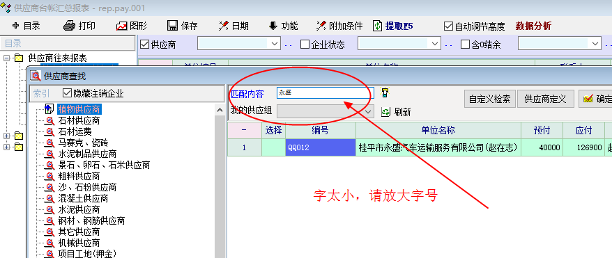 往来账报表中查找供应商的录入区字显示太小,请加大字号