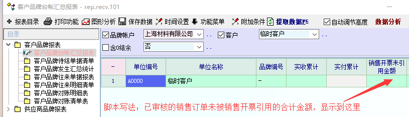 业务引用流程设置的是: 销售订单-->销售开票。 要写的脚本思路是: 在下图的报表中自定义一列为"销售开票未引用金额", 要显示内容是本客户同一品牌帐户且已审核的“销售订单“,未被”销售开票”引用的合计金额。