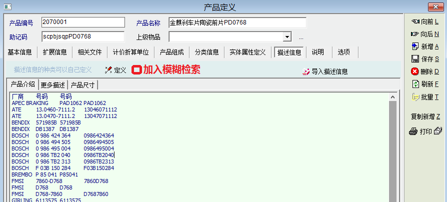 进销存软件目前模糊查询的内容限定在产品定义的“基本信息”中的各个字段。但是由于“基本信息”中的这些字段长度有限,很多时候需要把产品的重要信息放在“描述信息”页中加以补充描述。但是这样在模糊查询时,就查不到“描述信息”中的这些内容。 请考虑一下能否在“描述信息”中增加一个“纳入模糊查询”的选择框,让需要的人能查询到“描述信息”中的内容。