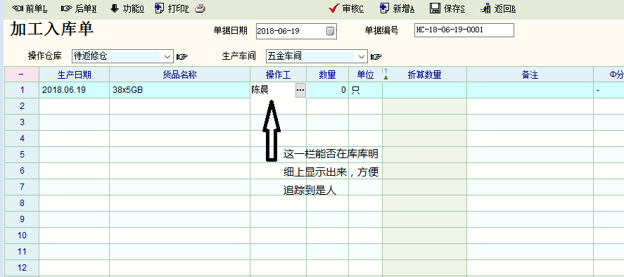 库存清单中能否显示 加工单中 操作工一栏 显出,这样有方便追踪到最新入库是谁生产的,