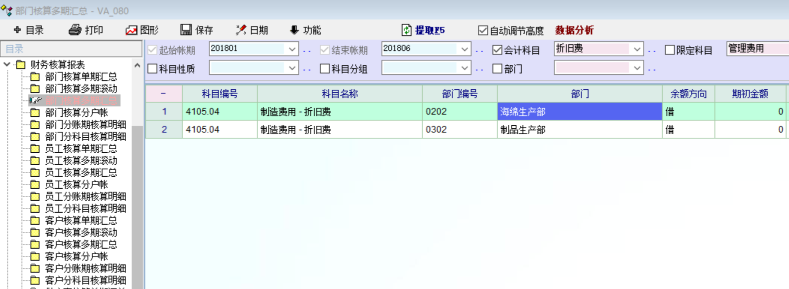 7.22版本的"部门核算多期汇总"只能用最末级科目进行查询,如果用上级科目进行查询,则结果不是汇总表,而是类同多期滚动表的分月汇总表