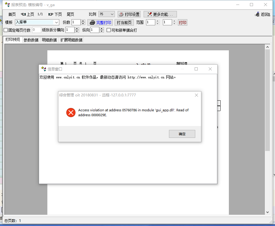 再现: 1、网络模式 2、任一单据,以入库单为测试 3、打印单据,在预览界面,点更多功能,点察看输出信息 4、弹出信息窗口,点关闭报错,进入循环。
