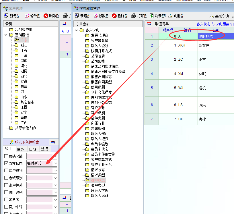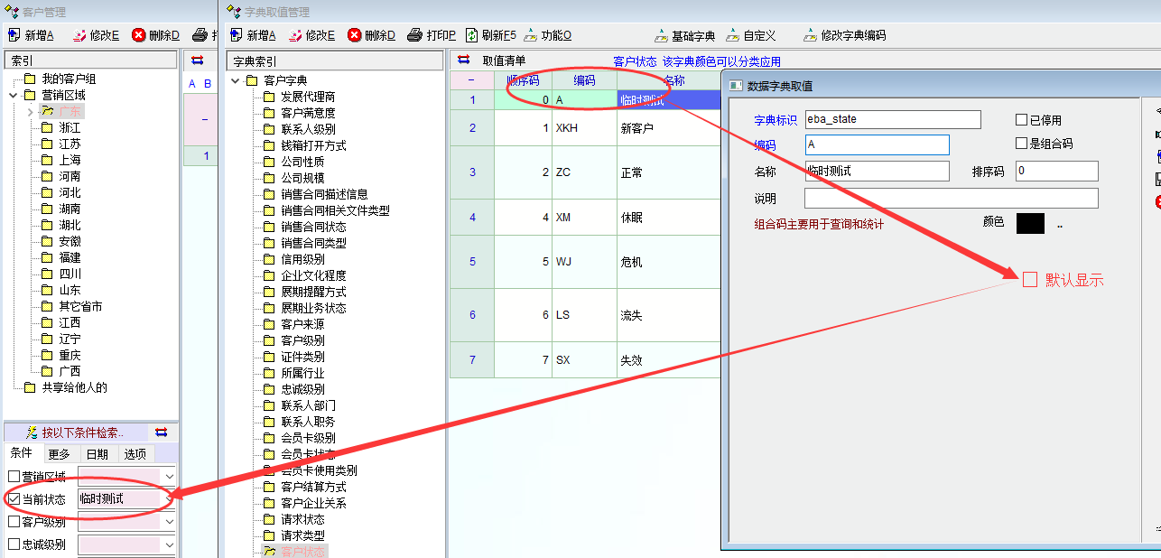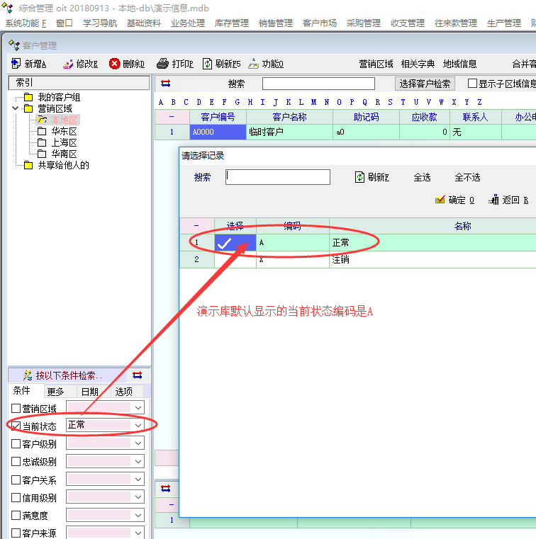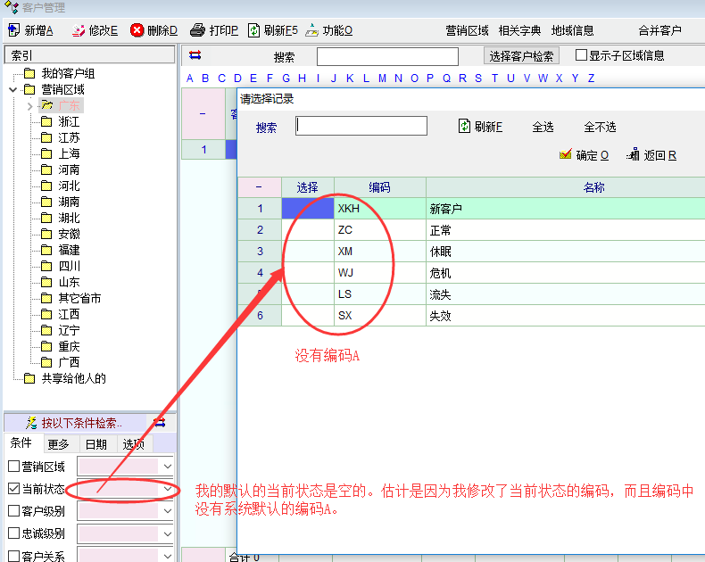 特意查看了演示库中的客户管理中的客户状态,发现打开客户管理时,系统确实是默认显示正常的客户(注销的不显示),如图1。再打开我的客户管理,却发现我的当前状态默认是空的,没有具体选项。进一步对比研究发现问题的关键应该是在演示库中,客户当前状态只有A(正常)和X(注销),系统默认显示编码A(正常)。而我的正式库中的客户当前状态有多种,编码和演示库不一样而且没有编码A,故当前状态就默认为空了。 |