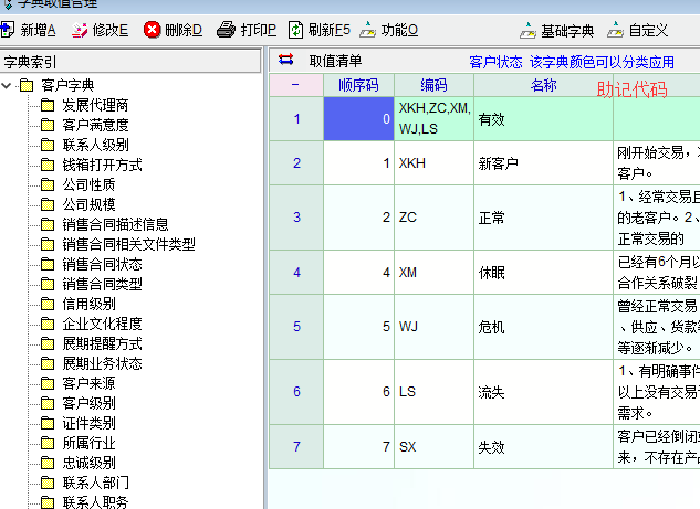 不区分大小写的助记代码使用起来感觉真的是非常方便快捷。建议为所有的字典都添加助记代码,这样不当使用起来非常方便快捷,也可以在一定程度上减少改变字典编码的次数。像我们改变字典编码往往就是为了可以通过直接输入字典编码而快速输入编码代表的内容。就像图片中所示,如果想输入“有效”这个组合码,只能通过鼠标点击选择或者输入“有效”一词,效率太低,也不方便。如果系统支持助记码,直接输入“ys"就可以了,多么方便快捷!