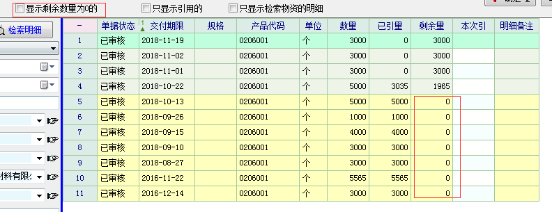 软件一直用的旧版本没这么更新,这次心血来潮更新下就出现了这个问题。。。。 单据引用下,选择【包含物资】项目,进行【检索明细】显示的结果, 即使【显示剩余数量为0的】项目没有勾选,都会将剩余为0的条目显示出来, 如附件图显示,这个怎么进行调整???