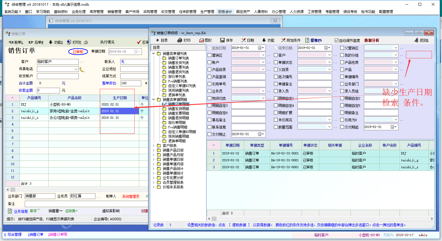 报表中缺少单据明细中的生产日期的检索条件,可以考虑增加,有时需要按明细中的日期列进行检索数据 。