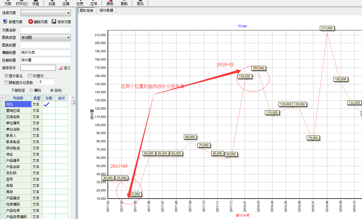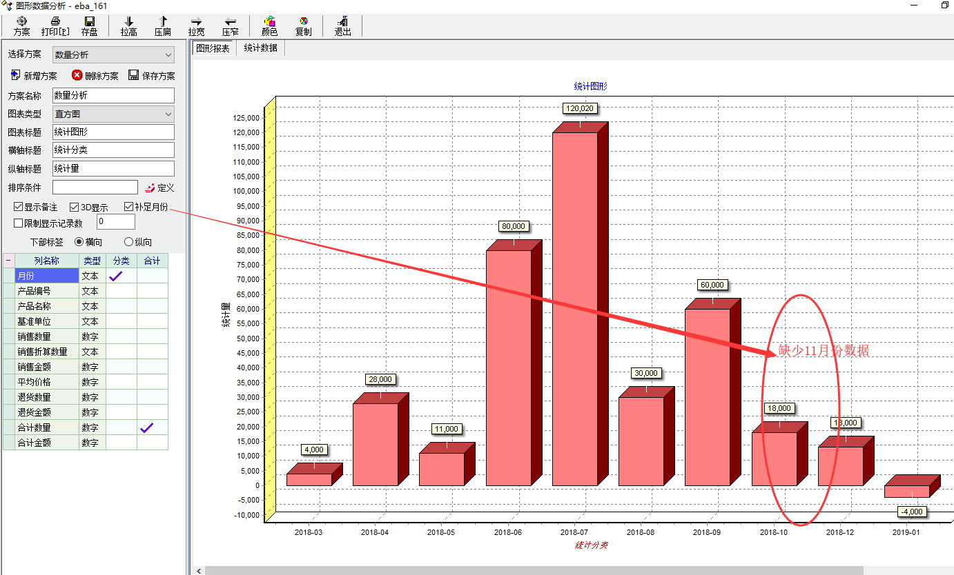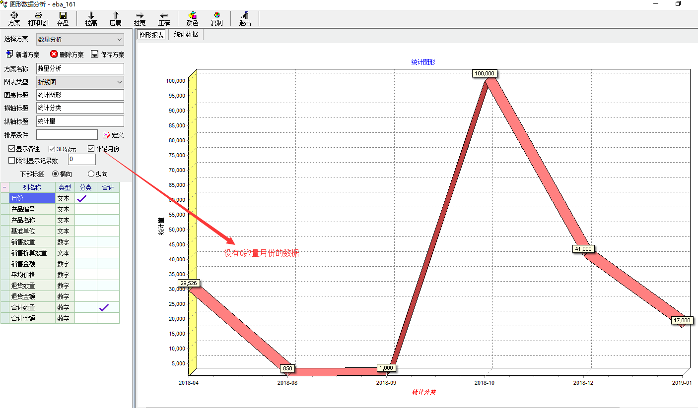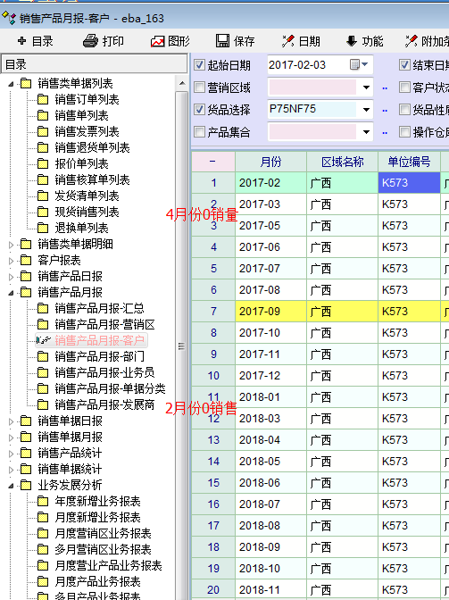 如图,报表中没有统计、显示0销售月份数据,导致在图形统计分析中的数据失真,失去了对不同月份进行对比的作用。建议在报表的检索条件中添加是否显示0销售月份数据的勾选项。
