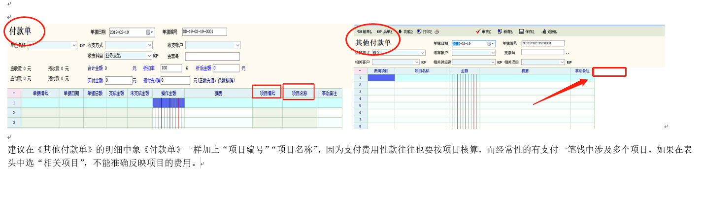 建议在《其他付款单》明细增加“项目”等辅助核算项,方便在记账凭证引用时,产生对应的核算项。