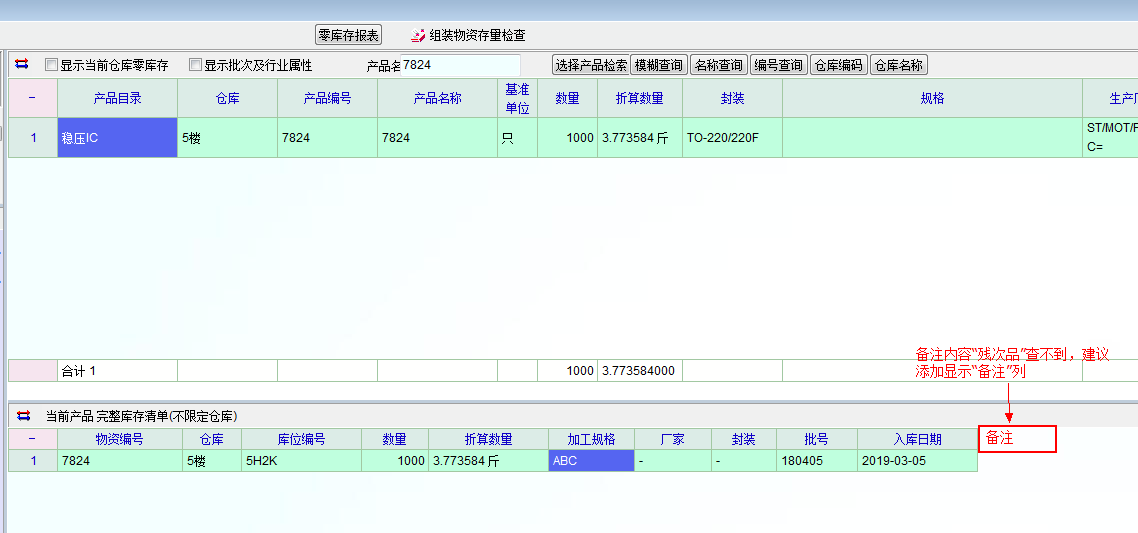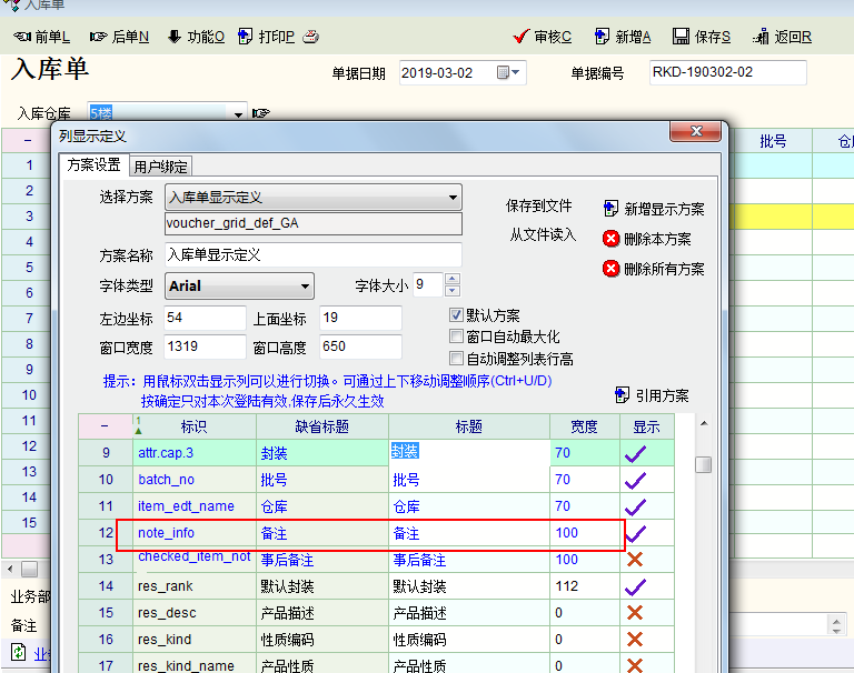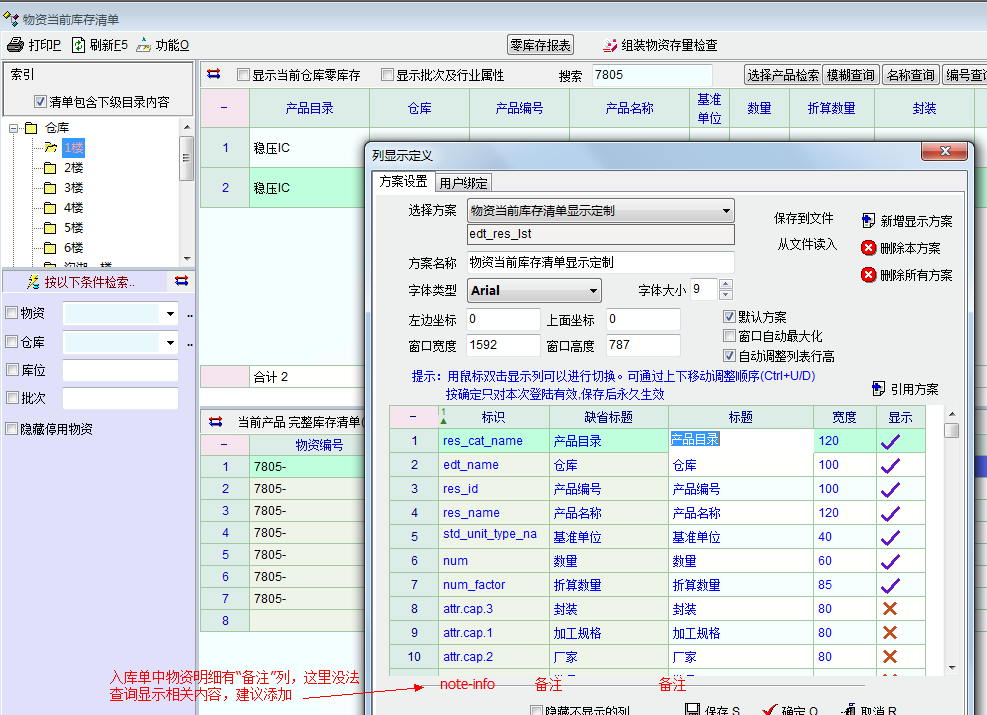 如图,当前产品 完整库存清单(不限定仓库)的列表中没法显示入库单明细物资的备注内容,建议在“显示定制”中添加此项内容。