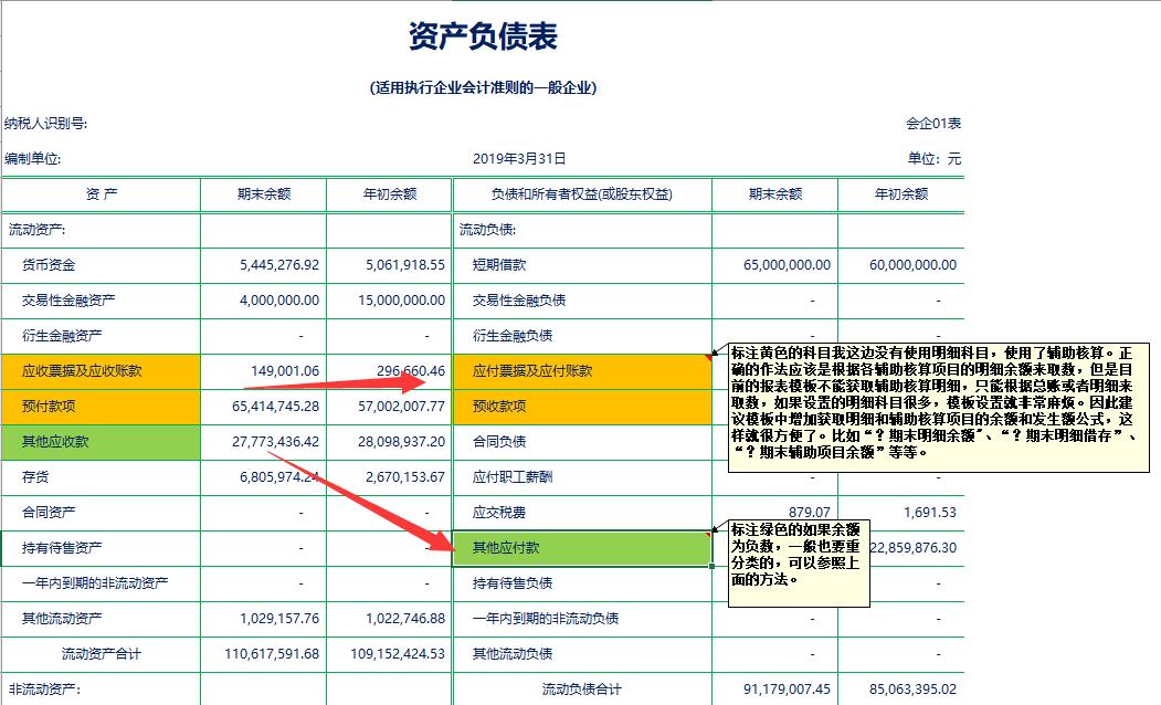 目前的会计报告模板已经比较完备,但是对于资产负债表,某些特殊的往来科目余额,在做会计报告时是要进行重分类的。比如说应收账款,它需要应收账款各明细科目(并非总账科目)的借方余额+预收账款各明细科目(并非总账科目)的借方余额之和才是正确的取数。对于明细较多的会计科目,目前的模板需要将各明细逐一进行判断才行,特别是如果以后增加或减少了明细科目还要重新对模板进行调整。尽管如此,尚能勉强应对,但是对于一些没有采用明细科目而使用辅助核算的会计科目来说(比如应收账款),就无法获取各明细核算项目的期末(期初)余额,而只能获取总账科目的余额,这与实际结果往往是有差异的,导致报表结果不正确。因此建议模板公式增加一些明细类和辅助核算类的取数公式,比如”期末明细借存“、”期末核算贷存“这样的公式,这样的话,问题就迎刃而解了,无论明细科目和核算项目如何变化,都无需再对公式进行调整。