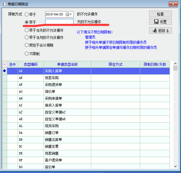 经常有业务员单据日期搞错,查找起来很麻烦。 有限定早于30天不能操作,能不能增加同时晚于30天也不允许操作 能不能限制为当月的前后一个月啊,这样范围也小点。 或者在原规则基础上,增加可以勾选的晚于当天不允许建立