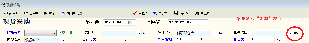 建议在出库单、采购单等所有单据中,选择“相关项目”中,增加延期项目的选择项