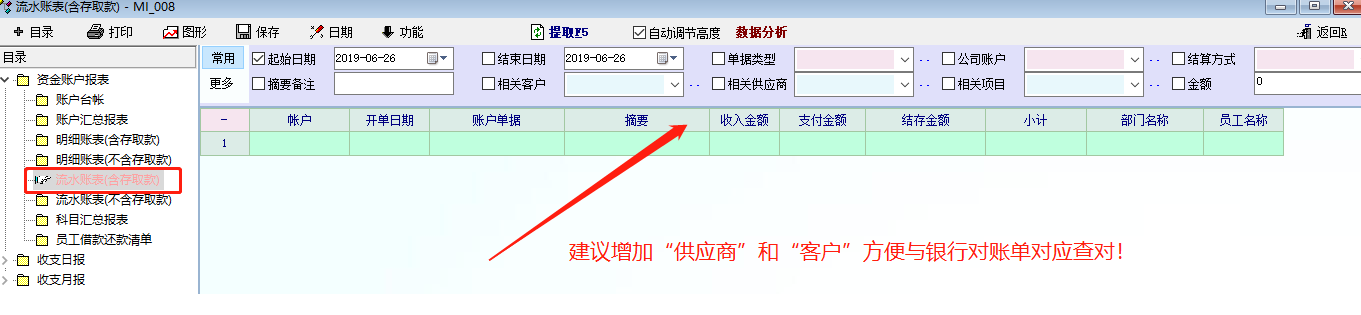 7月5日版升级增加了“供应商”和“客户”,但是《流水账表》显示又恢复了6月26日版之的显示,本来是同一笔支出显示一行即可,现在又分开多行显示了,还是对账不方便,请孟老师恢复每一笔收支显示一行,同时栏位包括“供应商”和“客户”。