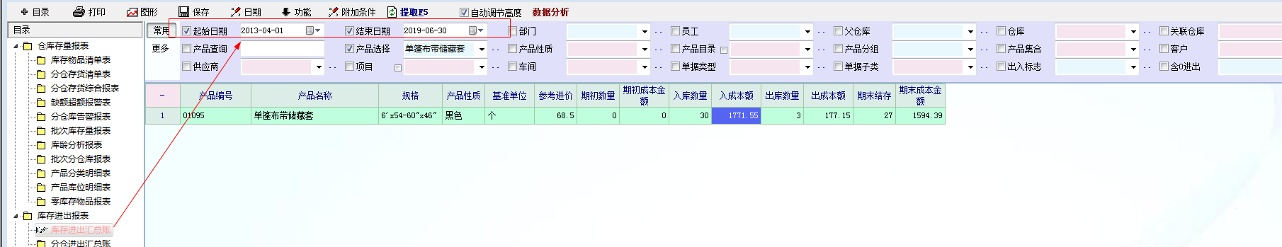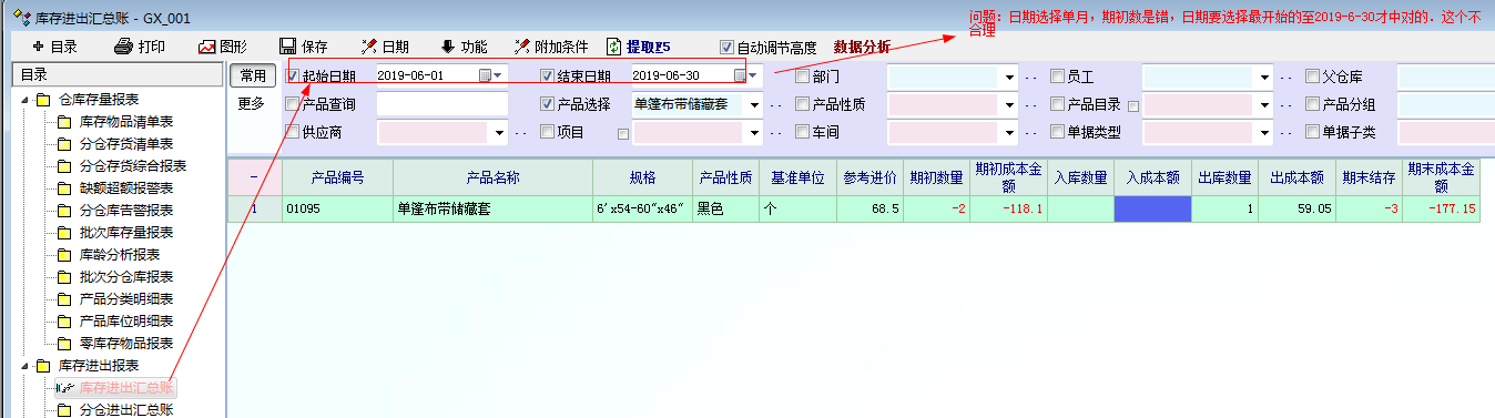 库存进出汇总表,选择190601-190630 期初数是错的,进而期末数也是错,需要选择最早的日期至190630才中对的